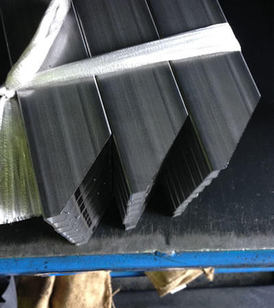 角パイプの片側Cカット。直角切や角度切が多いですが写真のようなCカットもできます。今回の事例は直線部分を10残して45度カット。直線部分を5など他の長さや他サイズでのパイプでも加工可能ですのでお問い合わせください。