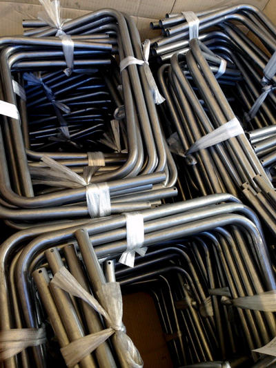 丸パイプの曲げ加工と2ヶ所に5ミリの貫通穴。受注数は338本。数物の曲げ・穴あけも対応いたします。写真のように網パレット支給していただければそこに収めて納品いたします。(キズがつかないようにダンボールでカバーしてから製品を入れます)
